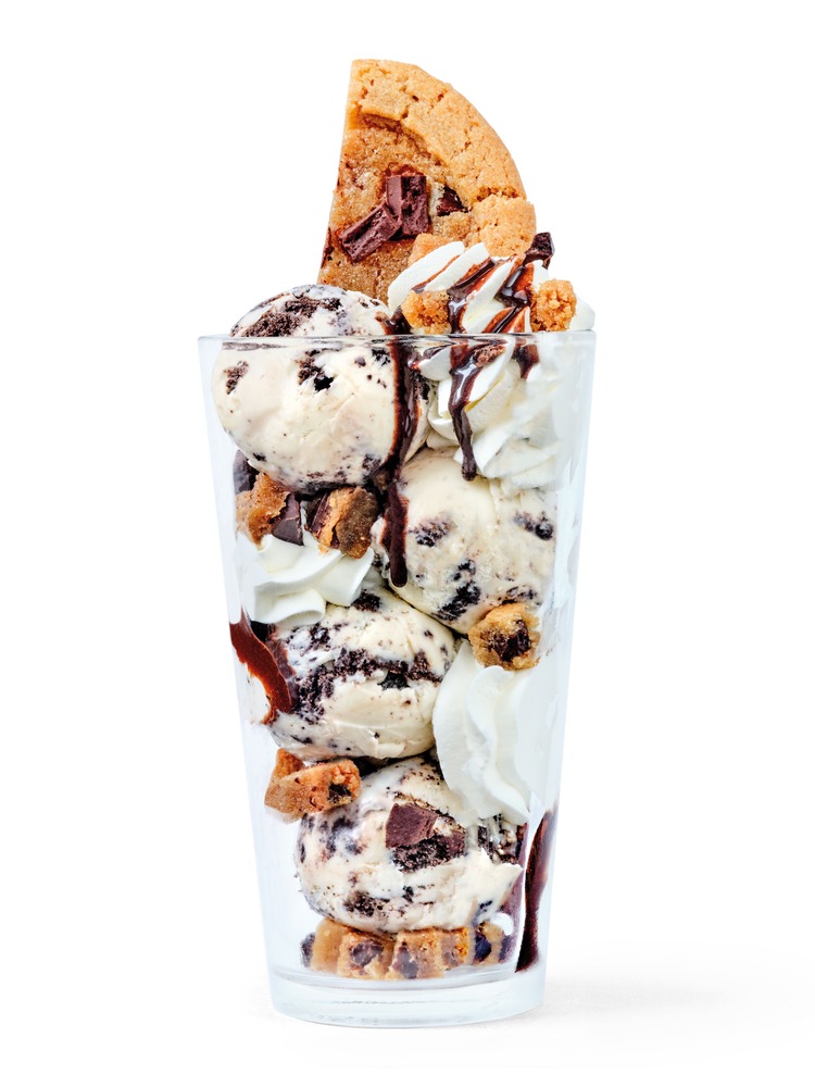 Een gehalveerde brownie, ingeklemd tussen een bol Belgian Chocolate en een bol Vanilla Caramel Brownie, gedecoreerd met slagroom en gekarameliseerde hazelnoten.Cookie Crunch
